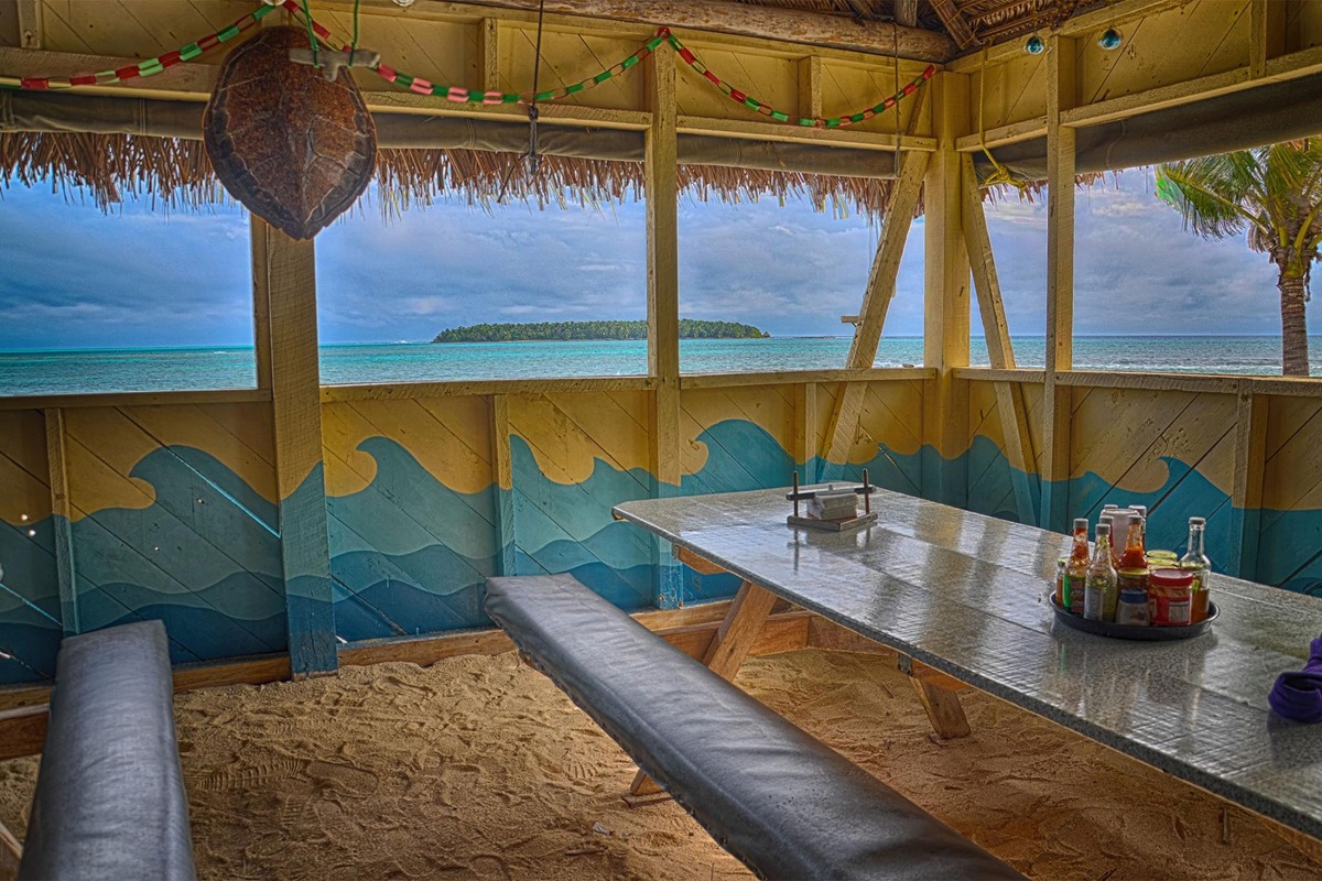 Our kitchen and dining hall, with open-air views of the lagoon and a neighboring island, become the center of island life, complete with solar-powered lights and refrigerators (cold beer and soda), propane stoves and our ever-growing library and game selection.