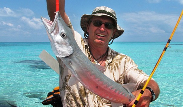 Pound for pound no fish in fresh or saltwater comes close to the fun of landing a bonefish. They have great heart and are relentless. Cully was standing next to me as I was beaching the first one I hooked. He ran to get a camera. Suddenly the bonefish took off again for about 100 yards into deep water. Then nothing. I brought the line back to find only a head and gill covers on my hook. Almost the entire body had been severed clean by a 4-1/2 to 5 foot long barracuda that Cully said had been hanging out in the lagoon recently. Guess what– two fish later the exact same thing happened again. I retrieved a head with no body. Cully couldn’t believe it.