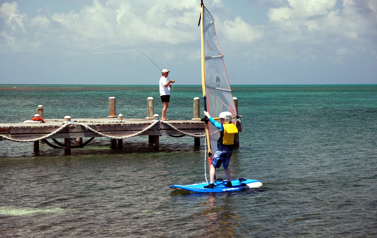 Although advanced sailors are on their own, our guides are proficient windsurfers and can assist novices on our land trainer and beginner boards. The calm waters of the lagoon are perfect for practicing first moves, and there is always enough wind for novices, making Long Caye an ideal location to learn the sport.
