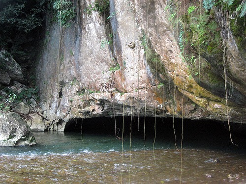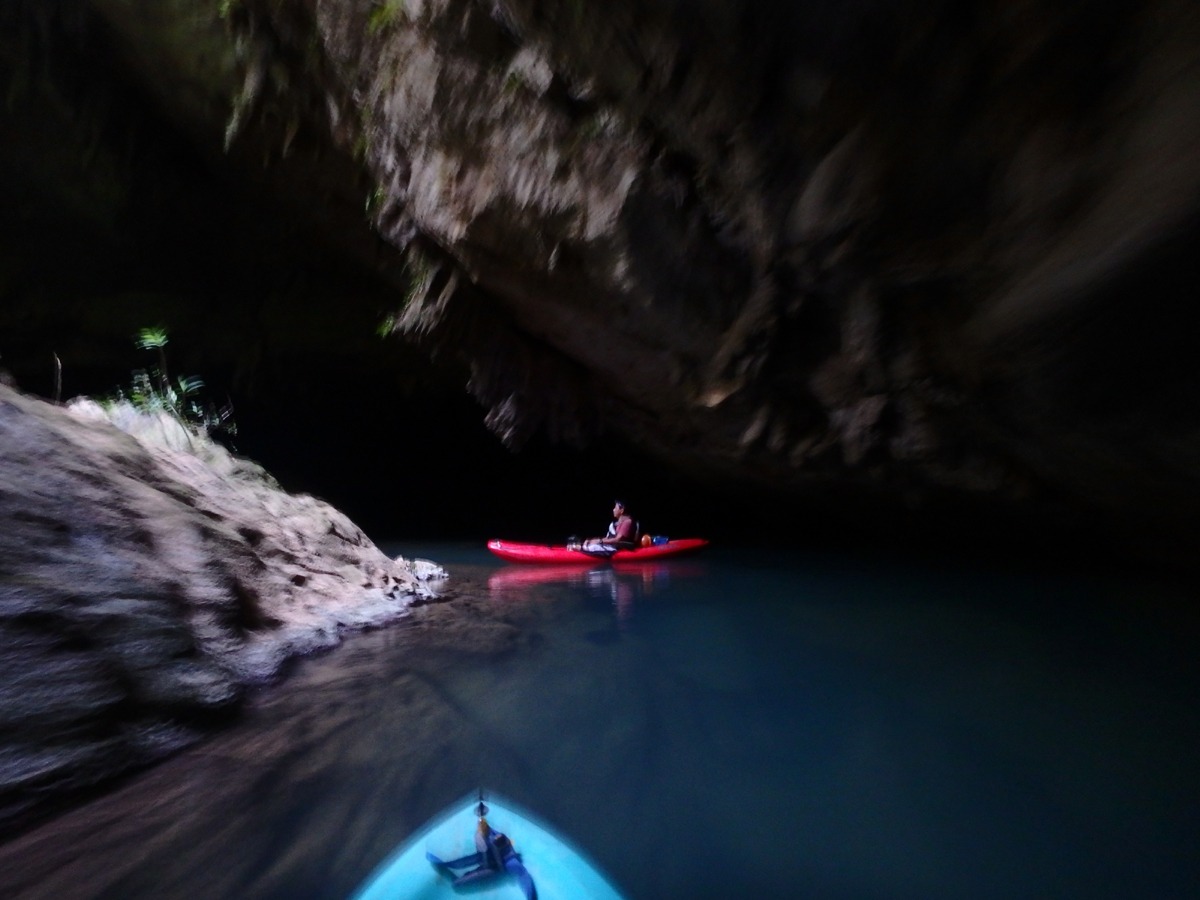 Huge white cliffs covered with vines rise dramatically from the thick jungle, and suddenly the river veers right into one, where we enter a river cave that soon envelopes us in complete darkness. Using headlamps for lighting the way, the current takes us though the caves, which occasionally pass by openings into the jungle.