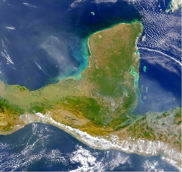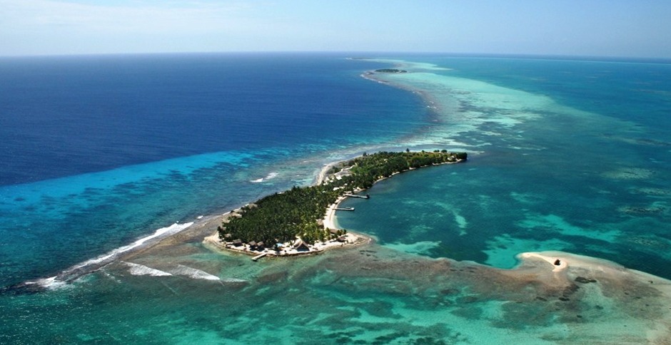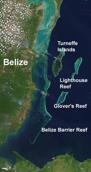 In the photo at right, the mainland is the large green mass on the left of the image. The Belize Barrier Reef is the light- colored edge that parallels the coastline. Beyond the Barrier Reef lie the three atolls of Belize: Turneffe Islands, Lighthouse Reef, and, the most remote of all (due to extreme distance from population centers), Glover’s Reef Atoll.