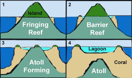One can observe the various stages of this geologic process on islands and atolls found in the Pacific. The Hawaiian Islands can be considered relatively “young” islands, with coral reefs growing around their perimeters very close to the shoreline. A “mid-stage” atoll would be represented by Tahiti, with a small central island surrounded by a ring reef several miles offshore, sheltering a large shallow lagoon between the reef and the island. Examples of “mature” atolls can be seen among many island groups in the Pacific such as Bora Bora where slender circles of coral surround huge lagoons full of coral formations but with few, if any, central islands remaining. Small islands of sand and rubble, such as those found at Glover’s Reef, are commonly situated on the edges of these atolls. The birth of the islands are not related to the formation of the atoll; they formed much later, and are much more transient.
